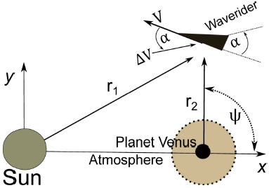 In those equations is lift, which is a force in the orbital plane of the spacecraft and perpendicular to its motion; is drag, a force in the direction opposite to the motion of the spacecraft. Because the trajectories are analyzed in the orbital plane, acceleration and velocity in the Z direction are null. Drag and lift are functions of the projected area in the direction of the motion of the spacecraft (A), the drag and lift coefficient [(CD), (CL), respectively], the density of the atmosphere and the velocity spacecraft-atmosphere of Venus (Vw). Equation (5) shows this dependency.