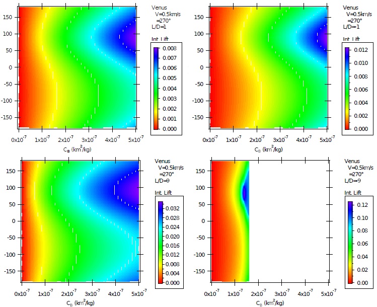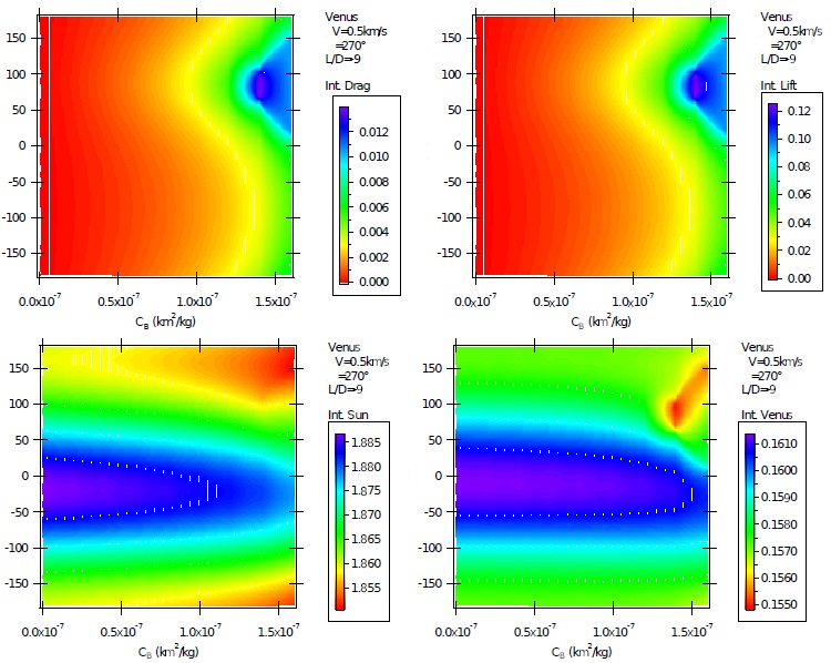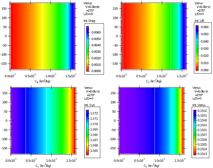 In the unpowered maneuvers, when L/D = −9, lift has a contribution in the range from 0.00 to 0.06 CU, depending on the ballistic coefficient. This implies a maximum contribution of around 37% of the contribution of the gravity of Venus, an important value. The contribution of drag is similar, just with the magnitudes divided by 9, since L/D = 9.