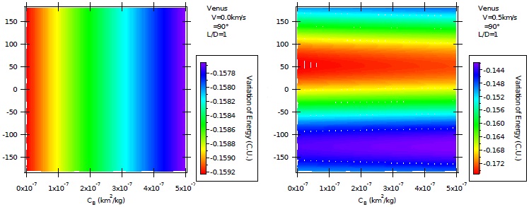 Figures 2 and 3 show the results when L/D = 1 and 9 with ψ = 90º, (maneuvers where the spacecraft looses energy [Broucke 1988]), for both powered (right side) and unpowered (left side) maneuvers. The powered maneuvers use a magnitude of 0.5 km/s. The unpowered orbits show that the removal of energy decreases with the ballistic coefficient, so the maneuver removes less energy with the increase of the atmospheric forces. This is the final result of the compensations that occur due to the extra energy that is removed by drag and the smaller reductions of the energy variations obtained due to the smaller effects from the gravity of Venus, since lift is pointing opposite to Venus, which decreases the angle of curvature. Of course, there is also the effect of moving the angle of approach from the optimal value, but this is a small effect compared to the others. The direction of the impulse (angle α) gives important effects on the maneuvers. For values of α larger than 120º, the plots are dominated by the green and blue colors, which mean smaller reductions of energy. It is also seen that the regions in the interval from zero to 120º have the largest values for the loss of energy, with the maximum occurring around α = 60º. This is the case where the impulse has a component pointing to Venus, which increases the effects of the gravity of the planet, as well as the atmospheric forces. This direction also gives a component opposite to the motion of the spacecraft, which directly removes energy from the spacecraft. The intervals below −60º have mainly a blue color, indicating the minimum removal of energy. This is a region where the propulsion is applied with a component pointing against the motion of the spacecraft, and another sending the spacecraft away from Venus, which reduces the gravity part of the maneuver. These results have the same general behavior for the maneuvers using the Earth (Murcia & Prado 2017b) and Mars (Murcia et al. 2018), but the magnitudes of the energy variations are very different. To perform the necessary conversions to show the results in the same units (the canonical systems are not the same for all the three systems), it is necessary to use the orbital velocities of the planets around the Sun. This is done because the unit of energy per unit of mass is the unit of the square of the velocity. The values for the orbital velocities are 29.78 km/s for the Earth, 24.07 km/s for Mars and 35.20 km/s for Venus. This means that the variations of energy in the maneuvers around the Earth have to be divided by 1.3971 (35.20/29.78)2 and the variations of energy obtained from Mars have to be divided by 2.1386 (35.20/24.07)2 to be compared with the equivalent results for Venus. The variations of energy obtained in the maneuvers around the Earth lie in the interval −0.0269 to −0.0275 canonical units of the Earth-Sun system (Murcia & Prado 2017b), which means −0.0192 to 0.0301 in the equivalent canonical system of units used for Venus. Regarding Mars, the variations of energy lie in the interval −0.0809 to −0.0813 canonical units of the Mars-Sun system (Murcia et al. 2018), which means −0.0378 to 0.0380 in the equivalent canonical system of units used for Venus. The present research indicates that the variations of energy given by Venus lie in the interval from −0.1592 to −0.1578 canonical units. Those values are much larger compared to the other two planets, about eight times the effects obtained when using the Earth and four times the variations giving by Mars. Those variations are functions of the combination of the values of the masses, radii and density profiles of the atmospheres of the planets, which makes it difficult to predict this type of results without performing the simulations made here. The results shown in the present paper indicate that Venus is the best planet of the three ones compared here, with Mars in second place. The Earth is the one that shows the smaller variations of energy in this type of maneuver.