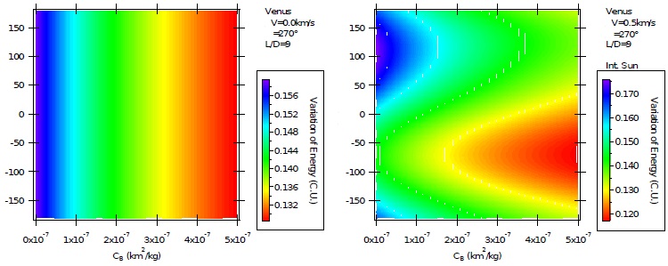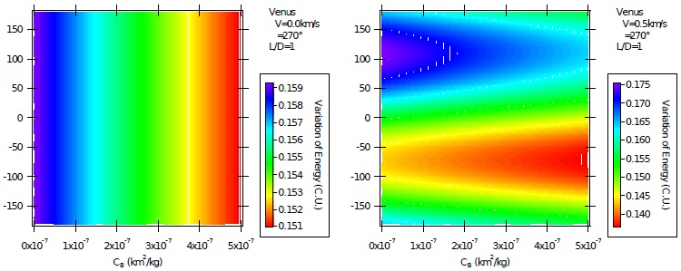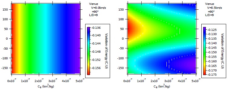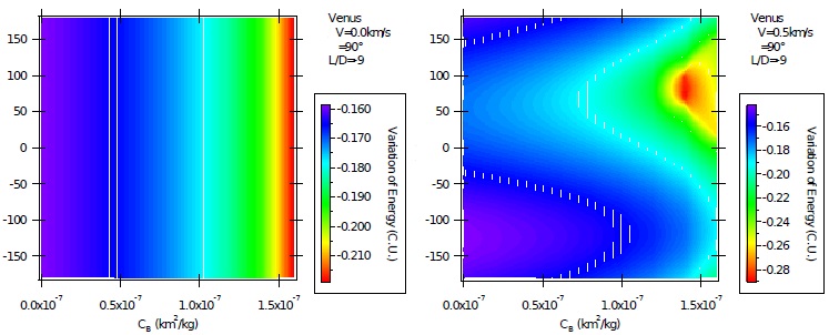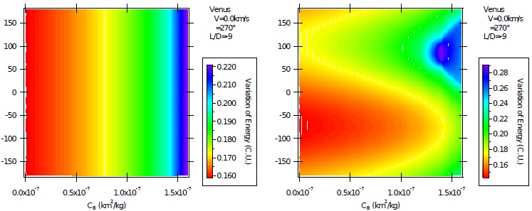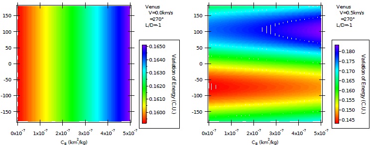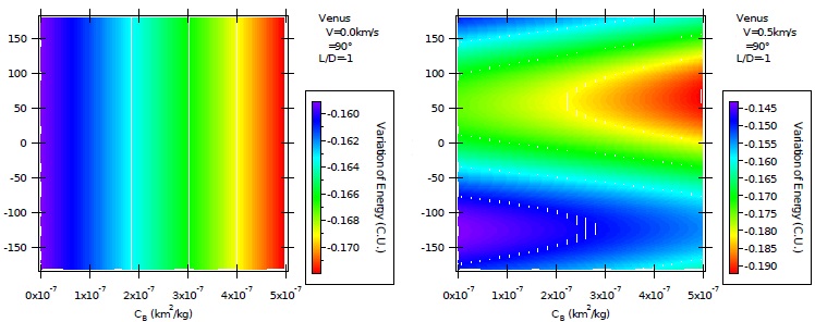 The powered maneuvers (right side) also show interesting results. The maximum and minimum variations of energy occur at the same locations, as already explained. The larger effects of the atmosphere can be observed in the inclinations of the lines separating two adjacent colors. As mentioned before, the yellow lines are very good examples, since they are no longer horizontal, as they were when L/D = 1. Following again a horizontal line (α constant), the borderlines between two colors show that increasing the ballistic coefficient can give larger values for the losses of energy. This happens because the negative values for the lift to drag ratio indicate that lift is pointing to Venus, so lift sends the spacecraft toward Venus, which increases the effect of the gravity part of the maneuver. Since this is a maneuver that reduces the energy of the spacecraft, the effects are combined with drag, both of them removing energy from the spacecraft. The consequence is that lift causes the maneuver to be very dependent on the ballistic coefficient.
