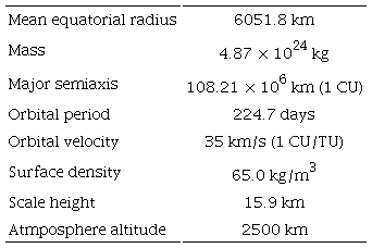 The complete system has Venus orbiting the Sun in a circular orbit and the spacecraft travelling around those two celestial bodies. The motion is assumed to be planar, with the spacecraft constrained to the plane of the motion of the primaries. The atmosphere of Venus is modeled by an exponential, expressed by ρ = 65 exp(−h/15.9) kg/m3, where h represents the altitude of the spacecraft with respect to the surface of Venus1, in km (see Table 1). A Runge-Kutta-Fehlberg 7/8 method with adaptative step size (Fehlberg 1968) is implemented for the numerical integrations performed here.