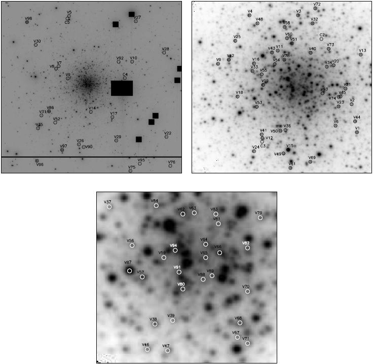 Finding chart of variable stars and candidates in NGC 6934. The identifications of V7, V8, V94 and V95 have been corrected. The positions of C2 and C3 correspond to the corrected coordinate values in Table 1. The top and left panel displays the complete FoV of our images and it is about 9.6 × 9.6 arcmin2. The top and right panel displays the central region of the cluster and it is about 2.3 × 2.3 arcmin2. The bottom panel displays the core region of the cluster and the field is 0.7 × 0.7 arcmin2. In all panels North is up and East is left.