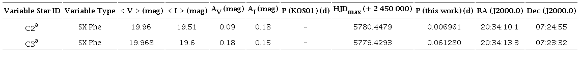 General data and corrected equatorial coordinates for the candidate variable stars C2 and c3