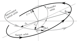 The target travels in its own orbit, and the interceptor orbits around the Earth. To calculate the orbit to be taken by the interceptor to fly by the target the initial position and initial velocity of the interceptor 0, 0 and the target 0, 0 are required. We look for the minimum change of velocity Δ 0, transfer = 0 + Δ 0, allowing overflight to be achieved. See Figure 1.