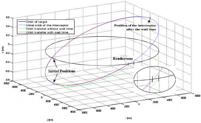 where θi and θ are the initial and final angles (after t1) between and , and w and W are the angular speeds of the interceptor and the target, respectively. In this paper we calculate t1 (the wait time), which is one of the results of the problem to be minimized for any kind of transfer orbit (in space) and maintains the same functional to be minimized. See Figure 2.