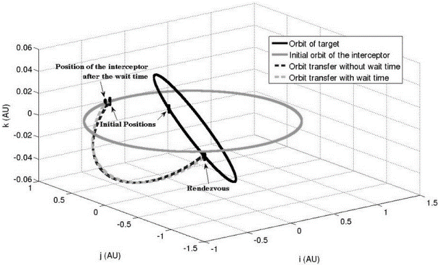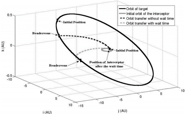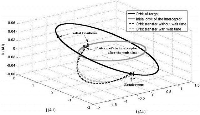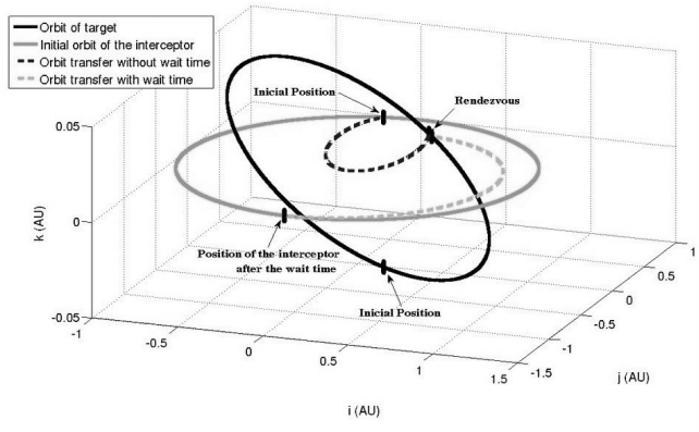 Thus, to minimize fuel consumption in the acceleration v [as in (Sharaf & Saad 2016)], the present article considers the methods proposed in Leeghim (2013), which are variations of the Lambert problem, with neither direction of motion in a plane nor the time t of the transfer at the beginning given; both are calculated. Another difference of our approach is the obtainment of the wait time t1 (Vallado 1997), where the interceptor does not leave its initial orbit until the relative positions of the bodies are convenient. This is presented in § 2.