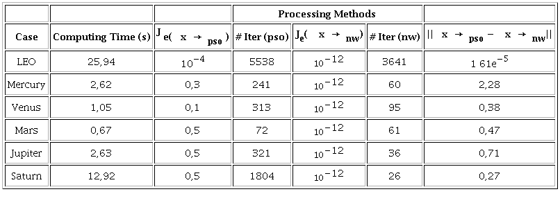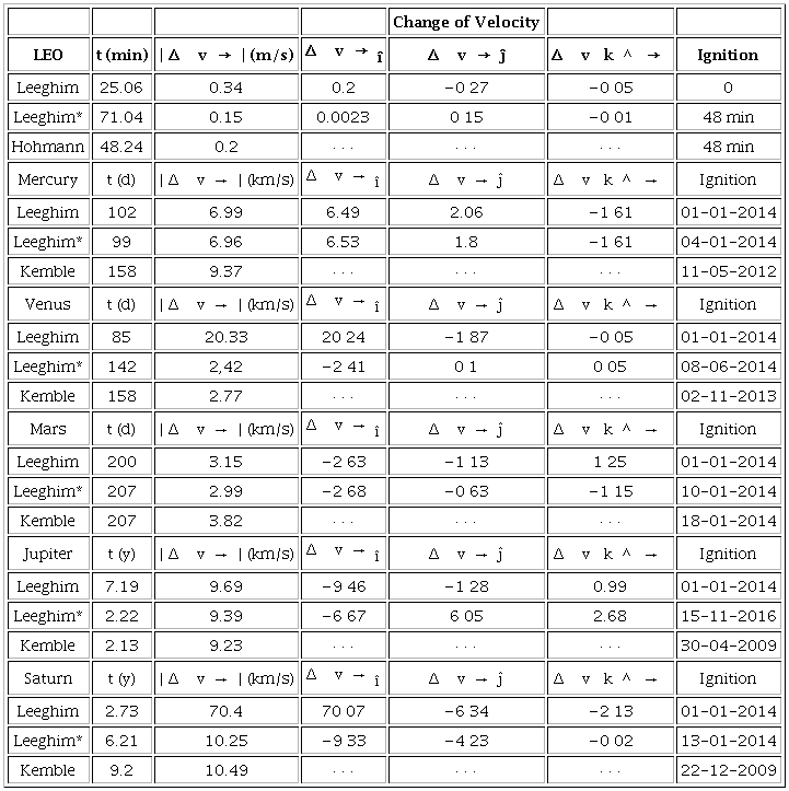Recently, authors such as (Gang et al. 2014; Shan et al. 2014; Zotes et al. 2012) have given important contributions to the study of spatial trajectory optimization. The latter have considered a geometric method with results far from those presented in this article, by having a large flight time with a v similar to ours.