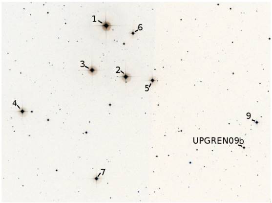 The observations were carried out at the Observatorio Astronómico Nacional (OAN) at San Pedro Mártir, Mexico using a 0.84m telescope with an attached spectrophotometer during six nights in the summer of 2018. On June 1 and June 2 the open cluster was observed. The nomenclature of Rufener (1971) was used to assign IDs to every star, except for a faint star near Star 9 at 2” in the SE direction. We identified this star as Upgren 09b. All are indicated in Figure 1.