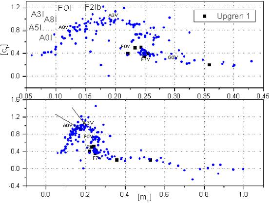 Figure 2 shows the position of the stars in the [m1] − [c1] diagram for those located in the direction of Upgren 1 on the same diagram of the stars with well-determined spectral types in the open cluster Alpha Per (Peña & Sareyan (2006)).