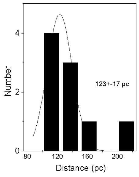 When the histogram of distance for Upgren 1 was built (Figure 3), the distances of the stars showed a clear accumulation at a distance of (123 ± 17) pc; the peak was determined by a Gaussian fit to the distribution.