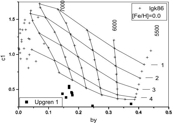 The effective temperature of the hottest stars was fixed by plotting the location of all stars on the theoretical grids of Lester, Gray & Kurucz (hereinafter LGK86), after calculating the unreddened colors (Figure 4) for the correct chemical composition of the considered model. The metallicity of Upgren 1 was not reported by WEBDA, but it is calculated in this work. Discarding the high value of Star 9, a [Fe/H] value of 0.039 ± 0.08 is obtained.