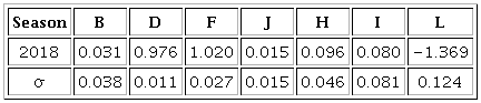 Table 5 compiles all the photometric values of the observed stars for the cluster. In this table, Column 1 reports the ID of the stars as listed by WEBDA (Paunzen & Mermilliod, 2006.), Columns 2 to 5 the Strömgren values V, (b − y), m1 and c1, respectively; next, Column N specifies the number of entries on average presented for each point; next column, the β value, and last Nβ, the number of entries for the average of β. Finally, for each star we present the mean value and in the following row, the standard deviation. As we can see, the standard deviation is on the order of a few hundredths of magnitude and the number of entries is always larger than four, except for β which has a smaller number in a few cases.