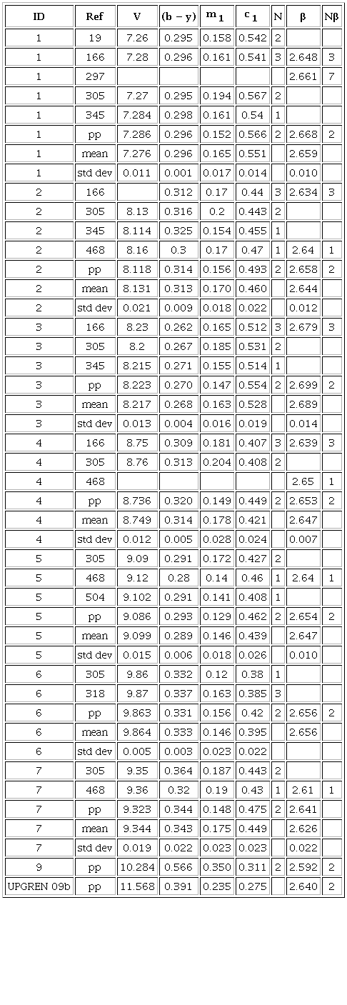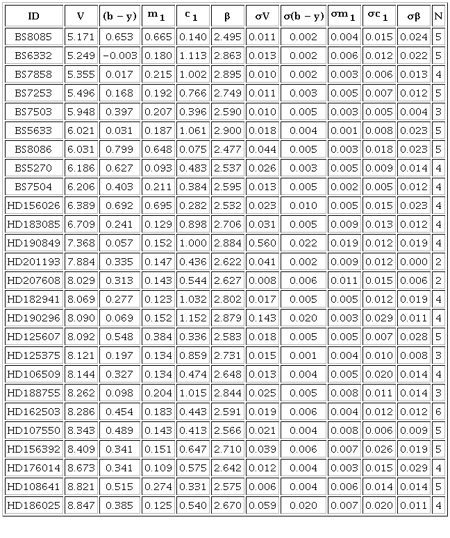 Once this was done for each night, a compilation of the transformation coefficients was carried out, and mean values and standard deviations were calculated. These are presented in Table 3. In this table Column 1 lists the V value; Columns two to six present the color indexes (b − y), m1, c1 and β and the standard deviations. These values are a few hundredths or thousandths of magnitude for each color index providing the accuracy of our photometry. Emphasis must be made on the fact that in total thirty-three uvby measurements (twenty-eight for Hβ) of the standard stars were calculated.