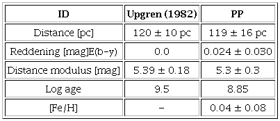 In 1982 Upgren, Philip, & Beavers (1982) in a study through narrow-band photometry with the four-color system and radial velocities stated that these data indicate that five of the seven stars were physically associated and formed a small cluster. The other two stars could also be members. The cluster distance is about 117 pc and its turn off point is near (B − V) = 0.5, which again suggests an age similar to that of the old open cluster M67. They also concluded that it forms the residual core of a much larger cluster, whose fainter members are no longer associated, and is probably in its final stage of dissolution.