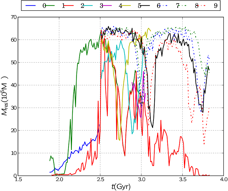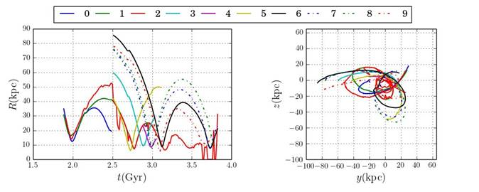 For each substructure identified in the simulation we investigated several properties. In GAS3 we identified 10 overdensities associated to the 10 densest peaks, labeled with numbers 0 to 9; for each one we start by determining their orbital evolution. Figure 8(b) shows the y − z projection of the orbit of the center of mass followed by each candidate. Figure 8(a) shows the distance of each candidate to the center of the disk of the host galaxy as a function of time. The notable aspect of this plot is the fact that the candidates persist during a significant amount of time, with lifetimes of the order of 1 Gyr or longer.