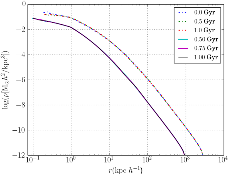 All galaxies are simulated in isolation after the generation of initial conditions in order to allow for numerical relaxation of the initial conditions. Figure 1 shows, for the dark matter halos, the convergence of the profiles from the initial conditions to the final relaxed density profiles. Note that the mass distribution only changes in the very inner region, and that after the first 1 Gyr the profile is relaxed. Also, the satellite galaxy reaches relaxation basically very close to the beginning. This check is relevant since it is important to make sure that there is no numerical artificial evolution on the density distribution of the galaxies, since in this way we can ensure that any change in the mass distribution of the system during the merger is due to the dynamics of the merger and is not spurious numerical noise or an instability originated from the initial conditions.