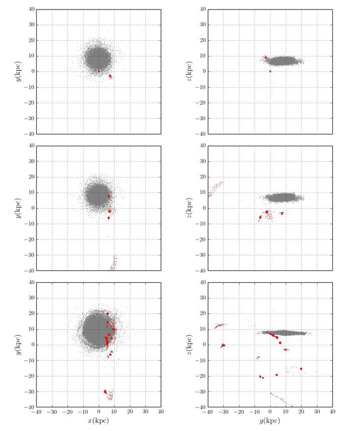 As can be seen in Table 2, the SPH particle mass is of the order of 5 × 103h−1M⊙ for GAS3. If we assume that typical masses for globular cluster candidates are of the order of 105 to 107h−1M⊙ in this simulation we can resolve globular cluster like structures with 20 to 2000 gas particles. Again, we are not interested to study star formation in those objects (which will imply the necessity of larger resolution simulations in order to properly sample star formation inside the clusters) but only to study study the collapse of gas in the candidate structures. Therefore, these numbers are good enough for the purposes of our work. We ran our simulations for a time interval of the order of 7 Gyr, long enough to study the evolution of the satellite remnants as would be observed at present.