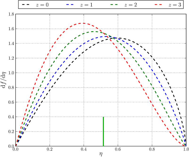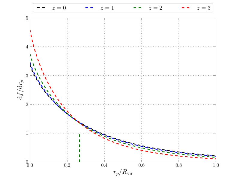 Then, to configure the merger we need to obtain realistic values of the initial position r0 and velocity v0 of the satellite galaxy. For that, from Wetzel (2011), we use the circularity η and the pericenter rp distance, which depend on the host halo mass Mhost and redshift z, and which for our host halo mass are distributed at the moment of their passage through the host’s virial radius according to the distribution functions shown in Figures 2 and 3. In both figures, the mean values of the circularity and the pericentre at z = 2 are highlighted with a small vertical green line.