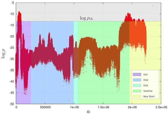 The EnBiD algorithm is sensitive to the spatial anisotropies of the mass distribution through the implementation of an anisotropic smoothing tensor. In this way, any density underestimation is prevented due to the ability of the method to use particles along a preferred direction, and not only spherically symmetric around the point of interest, as the isotropic kernels do. Figure 5 shows the estimated density for the total number of particles in one of the GAS simulations at t = 3.75 Gyr. In the figure we show the density of gas, halo dark matter, disk and satellite particles. New stars formed from gas particles are also included. Note that this figure not only shows the densities of particles ranked by ID (and type) but allows to see the high density peaks. As we know, these density peaks are associated to gravitational instabilities and should be related to anisotropies in the density distribution of each galactic component. Therefore, an adequate density threshold can be selected to extract the prominent overdensities in the particle distribution.