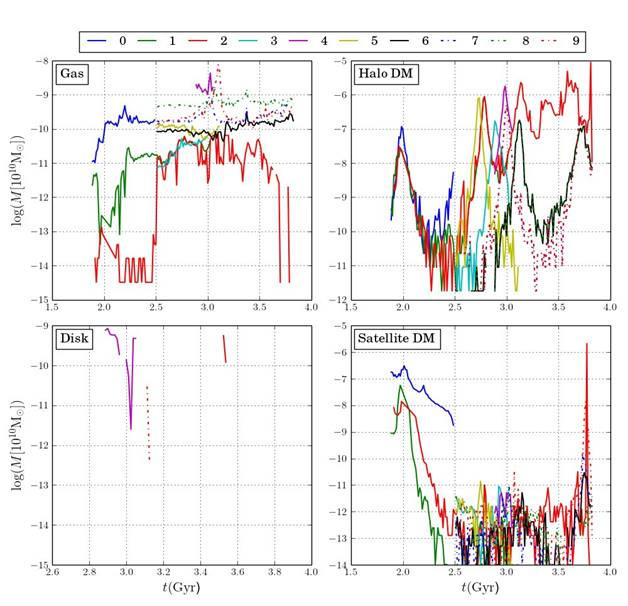 As can be seen in the figure, there are breaks in the mass curve located at about 2, 3.8 and 5 Gyr. These breaks are associated with the periastron passages during the merger. Clearly, the first passage strips the largest amount of mass from the satellite. Most of the mass ejected during the first passage is gas that is heated up during the collision and should remain bounded to the host galaxy, potentially forming the overdensities that are interesting for our study.