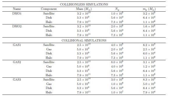The host galaxy in this work consists of a disk galaxy composed of a stellar disk and a dark matter halo. Neither gas in the disk nor a central spheroid are included in the model. The satellite galaxy is modelled as a spherical galaxy with a collisionless spheroid hosting a gaseous sphere in hidrostatic equilibrium. Initial conditions are computed using moments of the collisionless Boltzmann equation (Hernquist 1993; Springel et al. 2004). The dark matter halo of both galaxies follows a Hernquist density profile with scale length parameter adjusted to fit the shape of the NFW density profile, as done in Springel (2005).