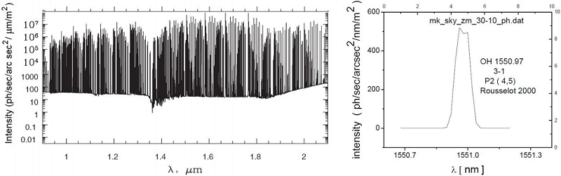 The spectrum of Figure 1 (left) shows the “forest” of OH emission lines in the range of 1 - 2 µm plus the components of zodiacal scattered light and thermal emission which are noticeable starting from 1.8 µm (Ellis & Bland-Hawthorn 2008). Figure 1 (right) shows in detail the 1,150.97 nm emission line from the database obtained with the ISAAC instrument of the European Southern Observatory (Near-Infrared Gemini Observatory 2015).