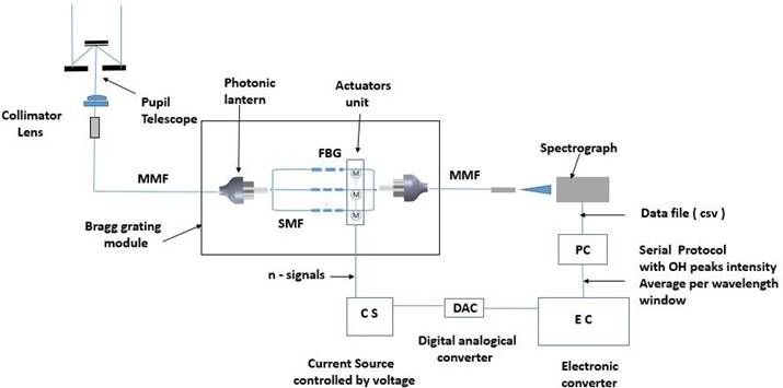 With the previous results, we identify a field of opportunity to improve the technique presently used with aperiodic FBGs: we propose the design of a new system, as shown in Figure 10, in which data of the optical intensity vs wavelength from the spectrograph are transferred to a computer system and the average of the target intensity peaks is calculated. This average value signal will drive a current source coupled to an actuator, the aperiodic FBG will be finely stretched to shift the Bragg wavelengths, thus reducing the average intensity of the emission lines during the observation of the NIR field. The actuator can be, for example, a small DC motor. It is expected that each aperiodic FBG can suppress approximately 50 OH emission lines; m is the number of Bragg modules required to suppress the total of emission lines in the band considered, n will be the number of single-mode optical fiber corresponding to the n number of modes at the multimode end of the optical fiber. The number of actuators will be therefore m × n. For example, in the system reported by Ellis and Bland-Hawthorn (Ellis et al. 2012) two aperiodic Bragg gratings and 19 single-mode fibers are used. In our proposed system this will give a total of 2 × 19 = 38 actuators. An electronics converter will be necessary to demultiplex output data form the OSA into 38 digital ports. 38 digital to analog (DACs) will provide 38 voltage signals applied to 38 voltage-to-current converters, and then to the 38 small dc motors to change their torque, that is, the force applied to the Bragg Module. This will work as an automatic control system in real time to actively tune the suppression system.