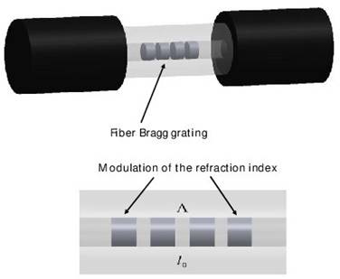 The disturbance of the refractive index in the core acquires the shape of a volume structure as shown in Figure 2 which acts as a filter and which allows it to reflect a particular wavelength band according to the design of the period of the grid; this wavelength, called Bragg wavelength, depends directly on the period Λ as well as on the effective refractive index neff of the core.