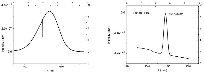Figure 3 shows the characterization of a commercially available FBG (Micron Optics os1100) (Micron Optics 2017) done at our laboratory. We used a superluminiscent broad-spectrum diode (SLD1550-A1) from Thorlabs as the source. The reflected Bragg wavelength is observed as a notch in the transmission signal detected by a Yokogawa AQ6370D optical spectrum analyzer. The reflected spectrum shown was calculated.