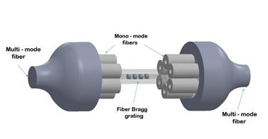 The use of optical devices as shown in Figure 4 allows to cover several of the requirements that the study of astronomical sources demands; it is necessary that the input end be in the multimode regime so it can accept the reduced optical power available; also, the device should cover the required bandwidth of the order of hundreds of nanometers. The assembly of a set of mono and multi-mode fibers by thinning would allow coupling the light coming from extended cosmic sources that emit at several wavelengths (which are captured by the telescopes), to conveniently separate them into different waveguides in whose interior Bragg grating have been drawn, which perform the function of selective filtering for certain wave profiles. The device can be bidirectional because the remnant of the radiation processed in the single-mode fiber cluster would have to pass directly to the spectroscopic analysis system by means of another multi-mode fiber end, thus recovering part of the power of the radiation front captured by astronomical instruments. Also, each single mode fiber could include several Bragg gratings simultaneously (León-Saval et al. 2005; Birks et al. 2015).