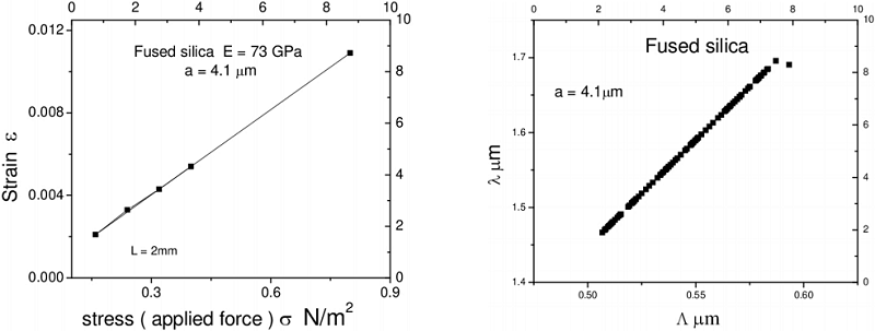 To confirm the possibilities of modifying the period of the Bragg grating by deformation induced by mechanical stress, some parameters of the silicon dioxide fiber with 8.2 microns of diameter core and 125 microns of external diameter were used, simulating a modulus of elasticity of 73 Gpa. The response is practically elastic as shown in Figure 5, which opens the possibility that when tension is applied within a previously selected range, a tuning of the Bragg wavelength can be achieved by modifying the period of the grating.