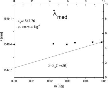 For a fiber of 125 microns diameter, g = 9.8066m/s2 and E = 70 × 109Pa (Fang et al. 2004).− we obtain a constant k = 0.009339[kg 1]. In the case of the Bragg grating, the period was taken from the manufacturer’s data, as well as the design wavelength at 1547.76 nm and the effective refractive index of 1.4682, with an approximate grating period of the 527 nm. Equation 8, where µ represents the mass of the suspended weight, is shown in Figure 6.