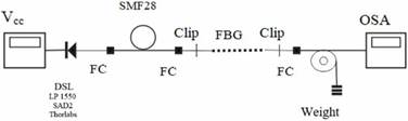 To carry out the simulation of a tension tuned FBG to reflect one of the emission profiles of the atmospheric OH radical, an experiment was designed and performed as shown in Figure 7. A single-mode fiber pigtailed laser diode LP1550-SDA2 from Thorlabs with a maximum optical power of 2.5 mW at a nominal current of 22.6 mA was used to simulate an OH NIR emission line at 1548.85 nm. Mechanical tension was applied by means of scale calibrated weights from 0 g to 55.83 g suspended to a commercially available Bragg grating OS1100 of Micron Optics. The FBG is printed in 10 mm of core of a compatible SMF-28 type optical fiber, coated with polyamide, a diameter of 125 microns, maximum reflectivity of 70%, FWHM = 0.25nm ± 0.05nm and a Bragg wavelength design of 1548.85 nm. The transmission spectrum was observed and recorded with an optical spectrum analyzer (OSA) Yokogawa AQ6315.