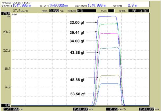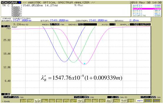 Figure 8 shows the spectral response of the FBG and how the Bragg wavelength shifts to longer wavelengths as the weight of the pulling mass is increased. As we discussed, the change of the period of the Bragg grating Λ caused by mechanical tension, proportionally displaced the peak of the wavelength in the reflected profile.