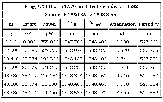 E = 70 × 109 Pa. Silicon dioxide elasticity module;Λ0 = Design period of the Bragg grating;Λ′ = Period of the Bragg grating after a stress effort;s = Cross section of the optical fiber (core and cladding); neff = Effective refractive index of the optical fiber;λB = Bragg wavelength design;λB′ = Bragg wavelength after mechanical stress; µ = Mass of a test calibration weight, used to exert mechanical stress;