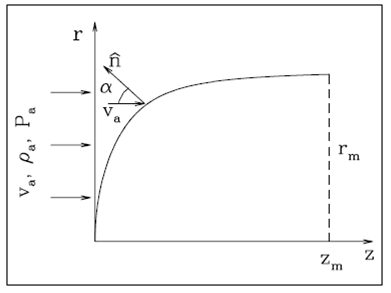 We consider the situation shown in the schematic diagram of Figure 1. In a cylindrical reference frame moving with the plasmon, the surrounding environment (of density , pressure Pa and isothermal sound speed ) impinges on the plasmon with a velocity va (this is the relative velocity between the environment and the plasmon).