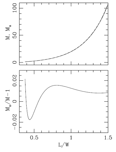 It is of interest to have an analytic expression for calculating the Mach number M of the plasmon flow as a function of the observed L/W length-to-width ratio. As equation (17) does not have an analytic inversion, we propose the fit: