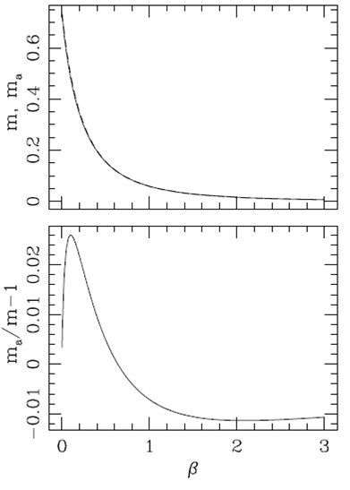 Figure 4 (top) shows the dimensionless mass m obtained from a numerical integration of equation (21) as a function of β, as well as the analytic approximation ma . The bottom plot shows the relative deviation between these two solutions, and we can see that the approximate analytic solution has deviations of less that 3% relative to the exact (i.e., numerical) solution.