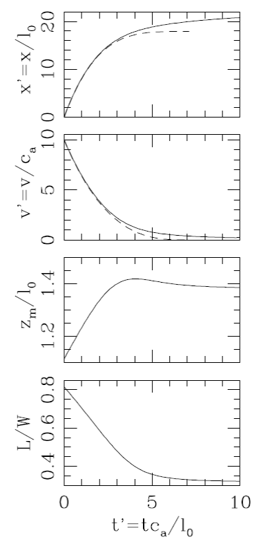 In Figure 5 we present a comparison of the “large Mach number” analytical solution (equations 32 and 34) with a full, numerical integration of equation (30) for a plasmon with a initial Mach number. It is clear that initially the two solutions are most similar, and that they start diverging when the plasmon slows down to . While the analytic, high Mach number solution (which is really not applicable in this low v´ regime) shows a plasmon which stops at a time t0 (see equation 33), the full solution gives a plasmon that gradually slows down but does not stop at a finite distance.