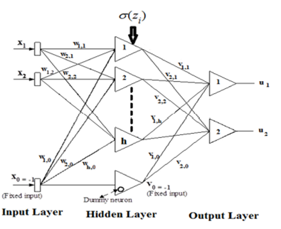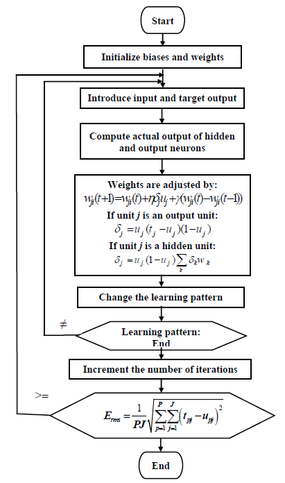 The back-propagation (BP) learning algorithm is a recursive algorithm starting at the output units and working back to the first hidden layer. A comparison of the desired output tj with the actual output uj at the output layer is executed using an error function which has the following form:
