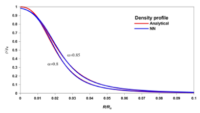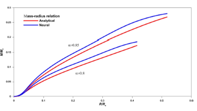 In Figures (6), (8), and (10), we plotted the predicted values of Emden functions, density profiles and mass-radius relations for some values of the fractional parameters listed in Tables 1 and 2. In these figures, due to the small change of the Emden function and density with the fractional parameter, and also the negligible difference between the analytical solution and the NN solution, we truncated the x-axis at a smaller value for more clarity. Again, there is a somewhat noticeable difference between the analytical solution and the predicted NN values in the case of the mass-radius relation (Figure 10) which is larger than the other two predicted NN values for the Emden functions and the density profiles (Figure 6 and Figure 8). This large difference may be attributed to the instability during performing and accelerating the series expansion of the fractional derivative of the Emden function (equation 10). It should be noted, here again, that the time taken to get the results of the validation and test phases, using the frozen saved values of the weights of the trained NN, is negligible (around 1 second). This proves the high efficiency and high-speed processing of the ANN when compared with the numerical and analytical methods.