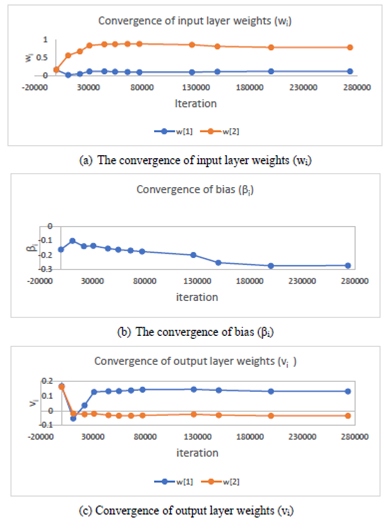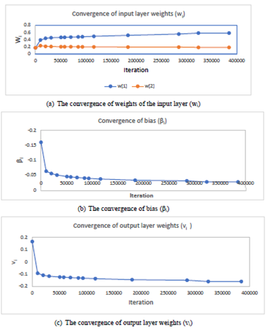For the demonstration of the convergence and stability of the values computed for the weight parameters of the network layers the behavior of the convergence of the input layer weights, bias and output layer weights (wi, βi and vi ) for the isothermal gas sphere case is as displayed in Figure 3. Moreover, the convergence behavior and stability of the values computed for the weight parameters of network layers (weights of the input layer, bias, and output layer) for the mass-radius relation case are shown in Figure 4. As these figures indicate, the values of the weights were initialized to random values and after many iterations they converged to stable values.
