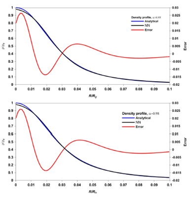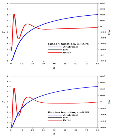 To ensure the training of the NN, we used two values for the fractional parameter α, not being used in the training phase as a validation and verification of the goodness of that phase. These two values are shown in the middle column of Table 2 and Table 3 for the isothermal Emden function, and mass-radius relations and density profiles cases, respectively. The obtained results for those two validation values are as shown in Figure 5 for the isothermal Emden function, in Figure 7 for the fractional density profiles, and in Figure 9 for the fractional mass-radius relations. As shown in these figures, there is a very good coincidence between the NN prediction and the analytical results for the Emden function, mass-radius relations, and density profiles, where the maximum absolute error is 1%, 2.5% and 4%, respectively. We plotted the analytical solution and the NN prediction for the Emden function and the density profile with different colors, but due to the overlapping of the two curves, they appear as one. The big difference comes from the region near the center of the sphere, for x ≤ 10. In the case of the mass-radius relation (Figure 9), the noticeable difference between the analytical solution and the NN is larger than that of the Emden function and density profiles due to the nature of the equation relating the mass to the radius (equation 10).