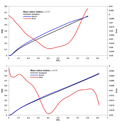 After multiple modifications and adjustments to the parameters of the NN, it converged to an RMS error value of 0.00002 for the training of the isothermal case, and to a value of 0.000025 for the training of the mass-radius relation and density profile case. During the raining of the NN, we used a value for the learning rate (α =0.03) and for the momentum (α = 0.5). These values for the learning rate and momentum proved to quicken the convergence of the back-propagation training phase without exceeding the solution. In this research, we have programmed our algorithms using the C++ programming language running on Windows 7 of a CORE i7 PC. The network training typically took around 3 hrs. to converge for each case of the training previously mentioned. The trainings were implemented concurrently on different windows of the same machine. After network training, the frozen saved weights were utilized to get the values of the desired output during the validation and test phases in a very short time (about 1 second), as described in the next section.
