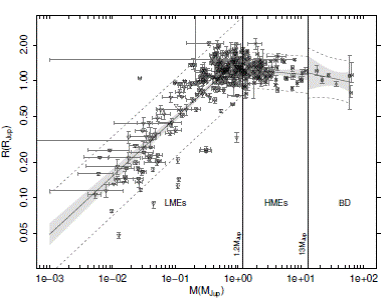 with a negative slope and a weaker correlation coefficient of r2 = 0.18, but sufficient to indicate that the trend is for the radius to decrease with the mass. This is as expected for objects where self-gravity is stronger than the electromagnetic repulsion (BDs not having enough mass to ignite fusion in their core cannot avoid the effect of gravitational collapse). Finally, in between these two mass limits defining the HMEs, we obtain the relation: