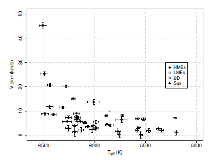 One difference between the two systems is that, although there are no correlations of the temperature with the surface gravity in the HMEs, there is an anticorrelation in the LMEs. Due to the smallness of our samples, it is difficult to make sense of this difference physically. However, we note that log g in the LMEs is also well correlated with the radius, the mass and the angular momentum (but not V sin i it- self), something not seen in the HMEs. In Figure 2 wee see that the dispersion of V sin i decreases at low temperatures, which implies that the bi-exponential relation of V sin i as a function of Teff and log g be- comes tighter, suggesting that the behavior of log g becomes more ordered, which could explain the anticorrelations with Teff and the correlations with M∗ and R∗ (and thus also with J∗).