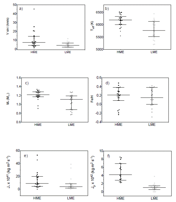 In Figure 5a, following Berget & Durrance (2010), we trace the specific angular momentum of the stars, j∗ = J∗/M∗, as a function of their masses, distinguishing between stars hosting HMEs and LMEs. The angular momenta of all the host stars in our sample fall well below the theoretical relation proposed by McNally (1965). There is a clear distinction between the LMEs and HMEs, except for the differences encountered in Figure 4 and confirmed in Table 2, and there is no evidence that the stars follow a j − M relation.