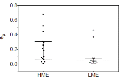 This implies that since the HMEs and LMEs have the same afinal 0.04 AU they should also have the same tidal evolution timescale, and thus no difference would be expected comparing their eccentricities. What stops the planet migration in the high-eccentricity tidal migration model is the circularization of the orbit through tidal interactions with the central star. Therefore, assuming the same tidal evolution timescale, we would expect the eccentricities for the HMEs and LMEs to be all close to zero (Bolmont et al. 2011; Remus et al. 2014). Note that using our data to test whether the HMEs and LMEs have similar distributions in eccentricity is possibly difficult, because we are not certain if an eccentricity of zero is physical or not (meaning an absence of data). For the HME sample, on 22 exoplanets we count 7 (32%) with zero eccentricity, while in the LMEs out of 23, 10 (43%) have zero eccentricity. The difference seems marginal. For the remaining planets with non zero eccentricities (15 HMEs and 13 LMEs) we compare in Figure 7 their distributions. There is a weak difference, with a median (mean) of ep = 0.19 (ep = 0.22) for the HMEs compared, to ep = 0.04 (ep = 0.10) for the HMEs and LMEs. A MW test yields a p-value = 0.0257, which suggests a difference at the lowest significance level. Therefore, there seems to be a trend for the HMEs to have on average a higher eccentricity than the LMEs. The HMEs possibly reacted more slowly to circularization than the LMEs (de Wit et al. 2016), suggesting possibly different structures due to their larger masses (Flor-Torres et al. 2016).