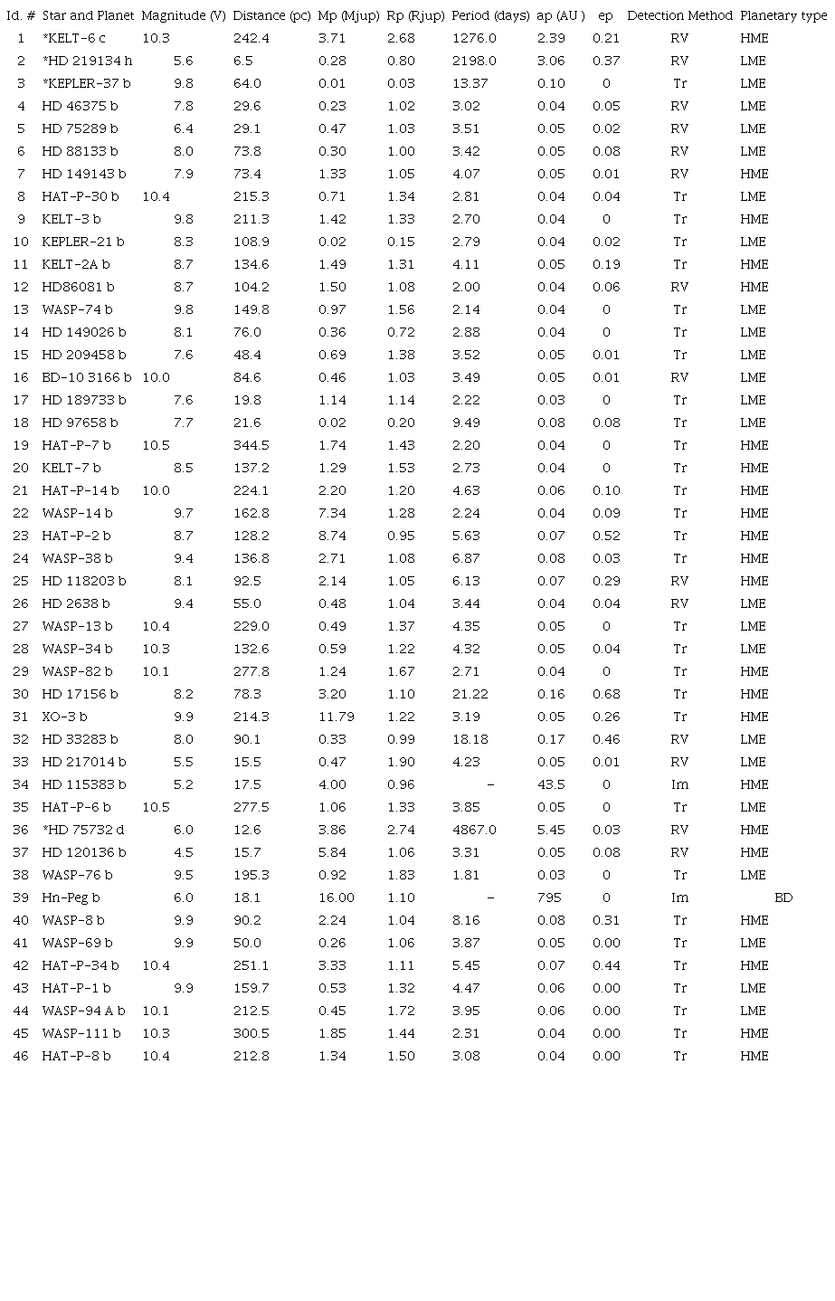Another point of importance that can be noted in Table 1 is the fact that we have only 14 exoplanets detected by RV. This is most probably due to the fact that we required the radius of the planets to be known, which is easier to determine by the Tr method. Curiously, only three of the 14 exoplanets detected by RV show the trend to be located farther from their stars than the Tr exoplanets, as observed in the literature (and as it is obvious in the Exoplanet Orbit Database). Two are close to the ice line and thus are rather warm than hot, and one with 3.86 MJup is at the same distance as Jupiter from the Sun. This implies that any bias introduced by the different detection methods, RV vs. Tr, can- not be explored thoroughly in our present analysis.