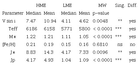 In Figure 4 we compare the physical characteristics of the stars that host HMEs with those that host LMEs. Figure 4a shows a clear trend for the rotational velocity to be higher in the stars hosting HMEs than LMEs. In Table 2 we give the results of non-parametric, Mann-Whitney (MW) tests. The use of non-parametric tests is justified by the fact that we did not find normal distributions for our data (established by running 3 different normality tests). In Column 6 we give the p-values of the tests at a level of confidence of 95%, in Column 7, the significance levels (low, *, medium, ** and high, ***) and in Column 8 the acceptance or not of the differences observed. Note that a non-parametric test compares the ranks of the data around the medians, not the means. In the case of V sin i, the MW test confirms the difference of medians at a relatively high level of confidence (stars 22, 33 and 36 were not considered due to their large uncertainties). In Figure 4b we see the same trend for Teff on average, also with a significant difference in median in Table 2.